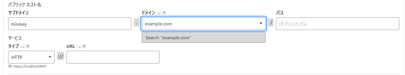 サブドメイン、ドメインに自分が決めたドメインを入力します。サービスのタイプはHTTP、URLはdockerを実行しているサーバーのローカルIPアドレス(例: 192.168.1.100など)にmisskeyのポートを指定したものを入力します。